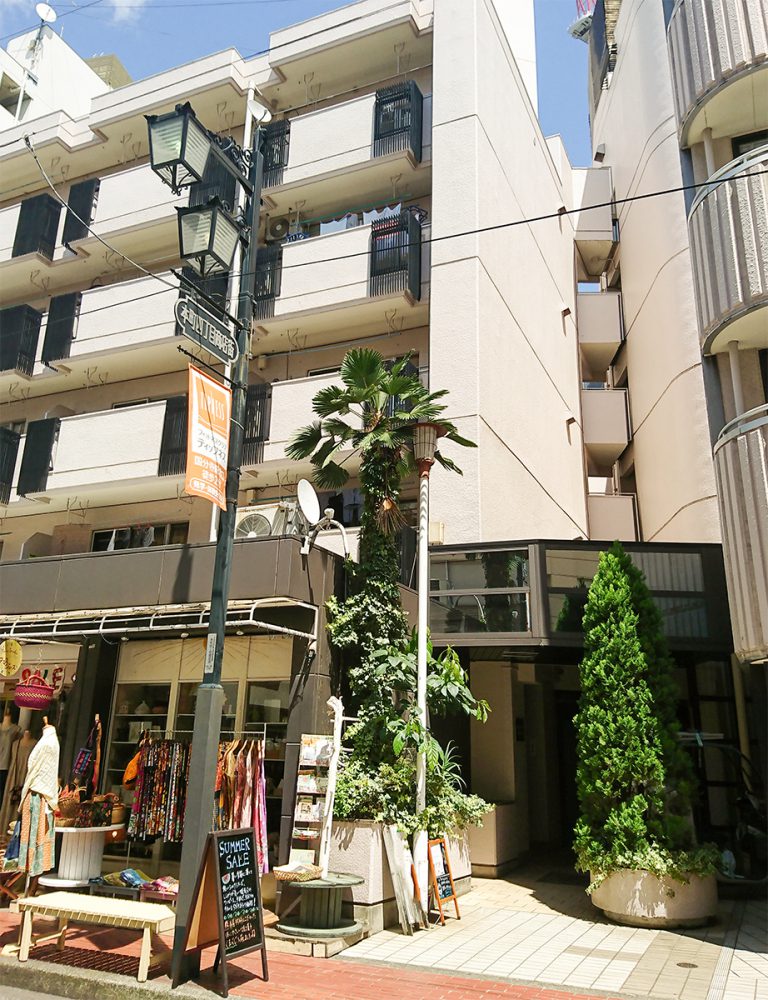 ①雑貨屋さん、くだものやさん、喫茶店の右側。『第五荒田ビル』とある入口にお進みください。
